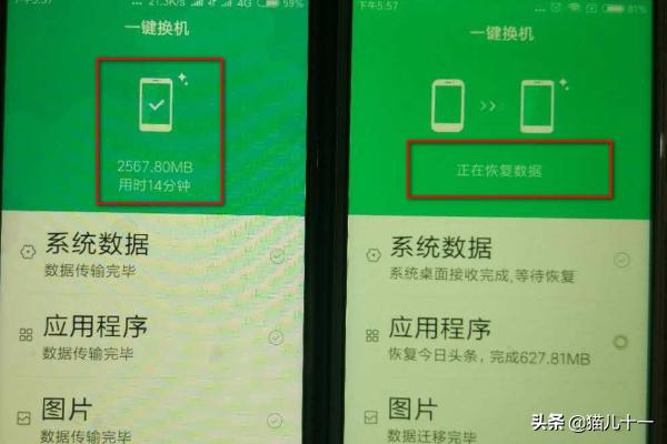 5.旧手机提示“用时14分钟”,已完成旧手机数据向新手机迁移;新手机提示“正在恢复数据”;