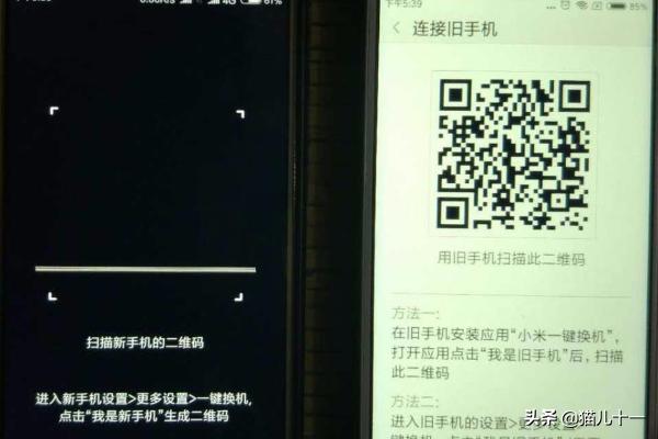 2.左侧旧手机弹出“扫描新手机的二维码”,右侧新手机弹出二维码提示“用旧手机扫描此二维码”: