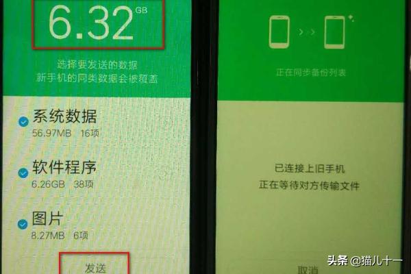 3.用旧小米手机扫描新小米手机,两部手机顺利建立连接,左侧旧手机会自动计算“系统数据”“软件程序”“图片”“音乐”“文档”等占用的空间大小,此处为6.32GB,计算完成后选择要迁移的数据,点击旧手机的“发送”: